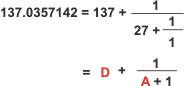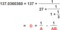 It is extremely important to absorb what is going on here. The first four terms of the continued fraction - derived from the experimental value of alpha inverse - are expressible as extremely simple combinations of the GenSet numbers A = 27, B = 37, and D = 137. This means that this expansion could be used to define the GenSet, with the value of C = 73 determined by the definition of D = A + B + C.