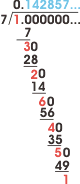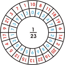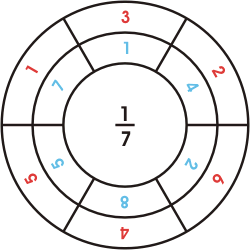 at the top of the inner circle and reading clockwise, we find the digits of the repetend, 142857. Starting once