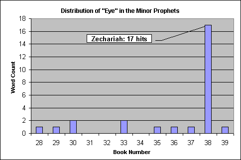 The obvious emphasis of the eye in the book of Zechariah is easily measured. The graph below shows the distribution of all occurrences of the word eye or eyes in the Minor Prophets. The massive peak of 17 occurrences corresponds to Book 38, Zechariah!