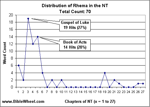 The only other book to approach this frequency is the Gospel of John which differs markedly from Luke in that Rhema is not characteristic of John's other writings. This is contrasted with the word Logos, for example, which marks most of his writings, (cf. John 1.1, 1 John 1.1, Revelation 19.13).