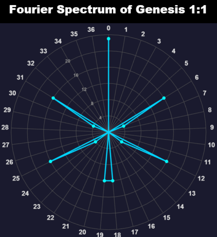 You know about the 23 sums of subsets of the 7 words of Genesis 1:1 that are multiples of 37? God led me to do a Discrete Fourier Transform of the set and I found that all the subsets are constrained to a very small set of possible values modulo 37, and that they are perfectly symmetric around the value 0 = 37 and that that they form the IOTA CHI monogram of our Creator Jesus Christ!