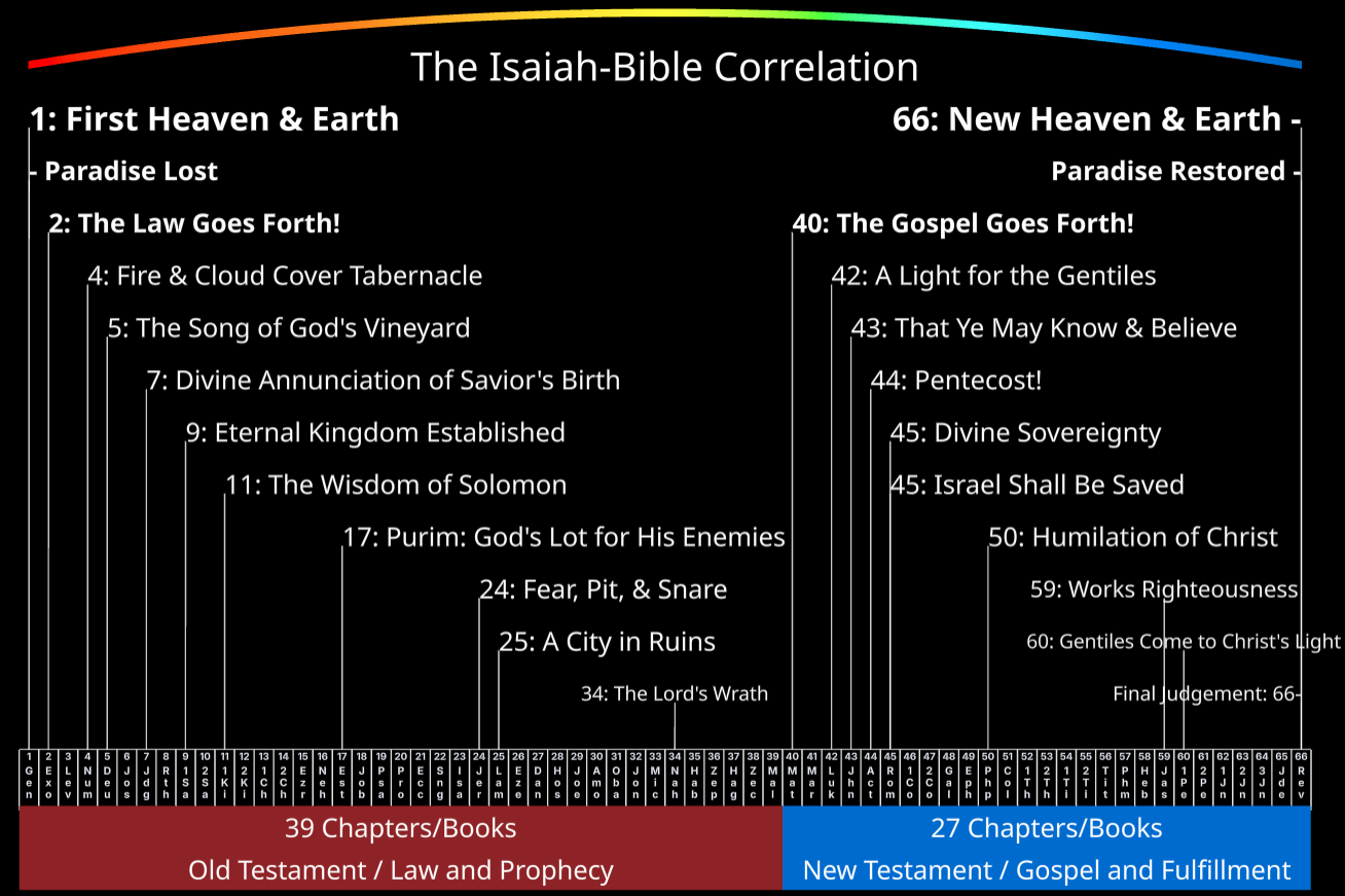 Here's an example of the kind of depth I see in the Isaiah-Bible Correlation. Everyone one of these titles in this graphic is a link between Isaiah Chapter n with Bible Book n. For example, the Law goes forth in Exodus and so Isaiah 2 says "And many people shall go and say, Come ye, and let us go up to the mountain of the LORD, to the house of the God of Jacob; and he will teach us of his ways, and we will walk in his paths: for out of Zion shall go forth the law, and the word of the LORD from Jerusalem."