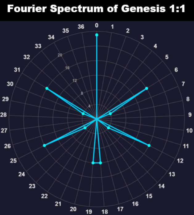 On New Years Eve last year, the Lord led me to expand Vernon's analysis using a Discrete Fourier Transform, which revealed an underlying unity to the entire set of 127 sums derived from the seven words. With a random set, the numbers would be uniformly distributed across all 37 possible residues (remainders mod 37). The vertical spike at 0 mod 37 represents the 23 values divisible by 37. The other arms represent the residues of the other sums. They are obviously NOT random as would be expected by a random set.